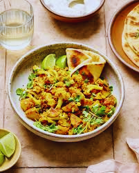 Ingredients : Cauliflower, onions, tomatoes, garlic, ginger, turmeric, cumin, coriander, chili powder, coconut milk, and cilantro.